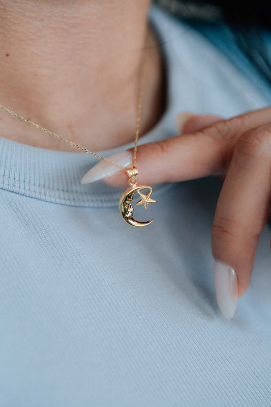 14k Solid Yellow Gold Moon And Star Pendant Charm | Luna Estrella Necklace | Astrology Jewelry Gift