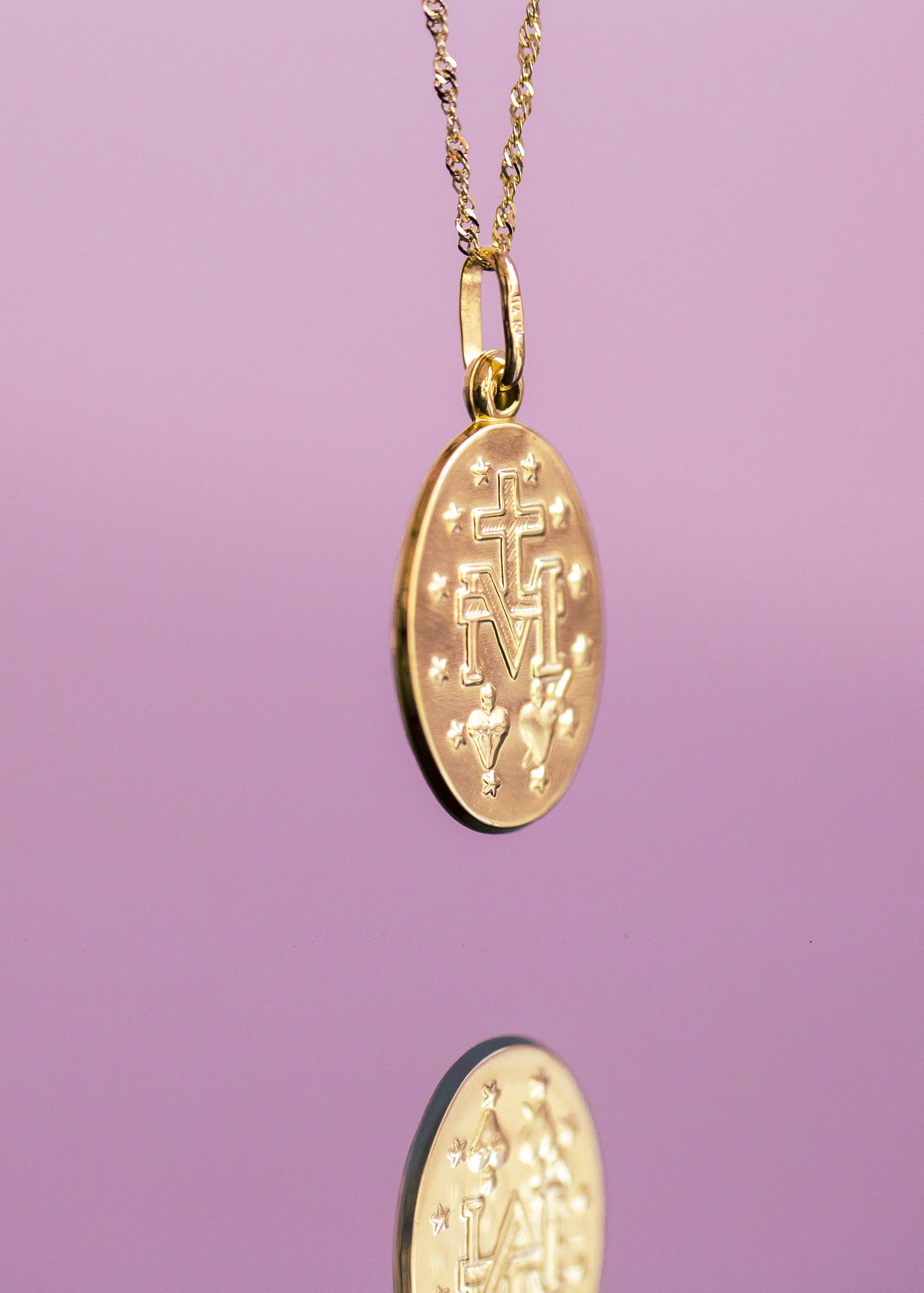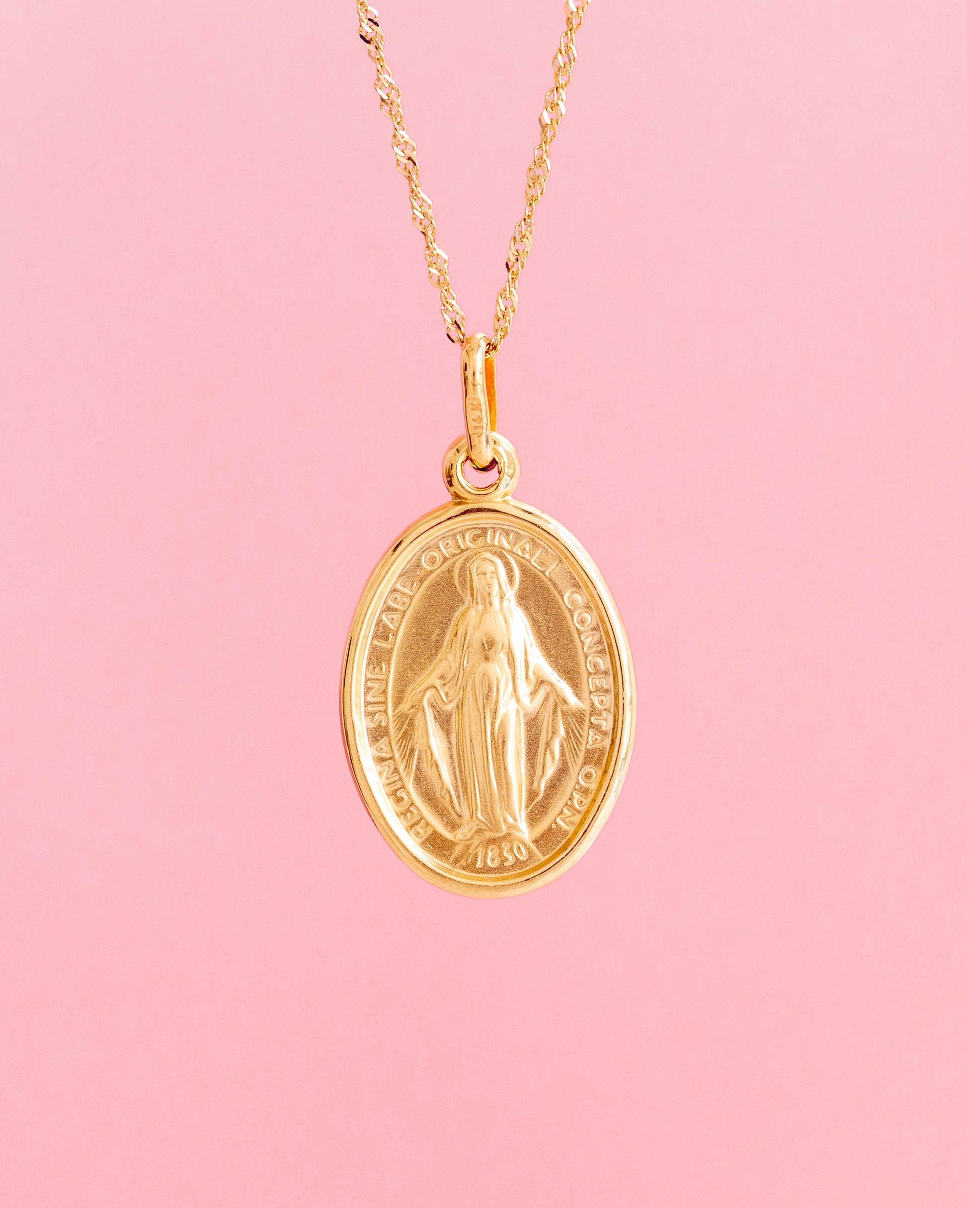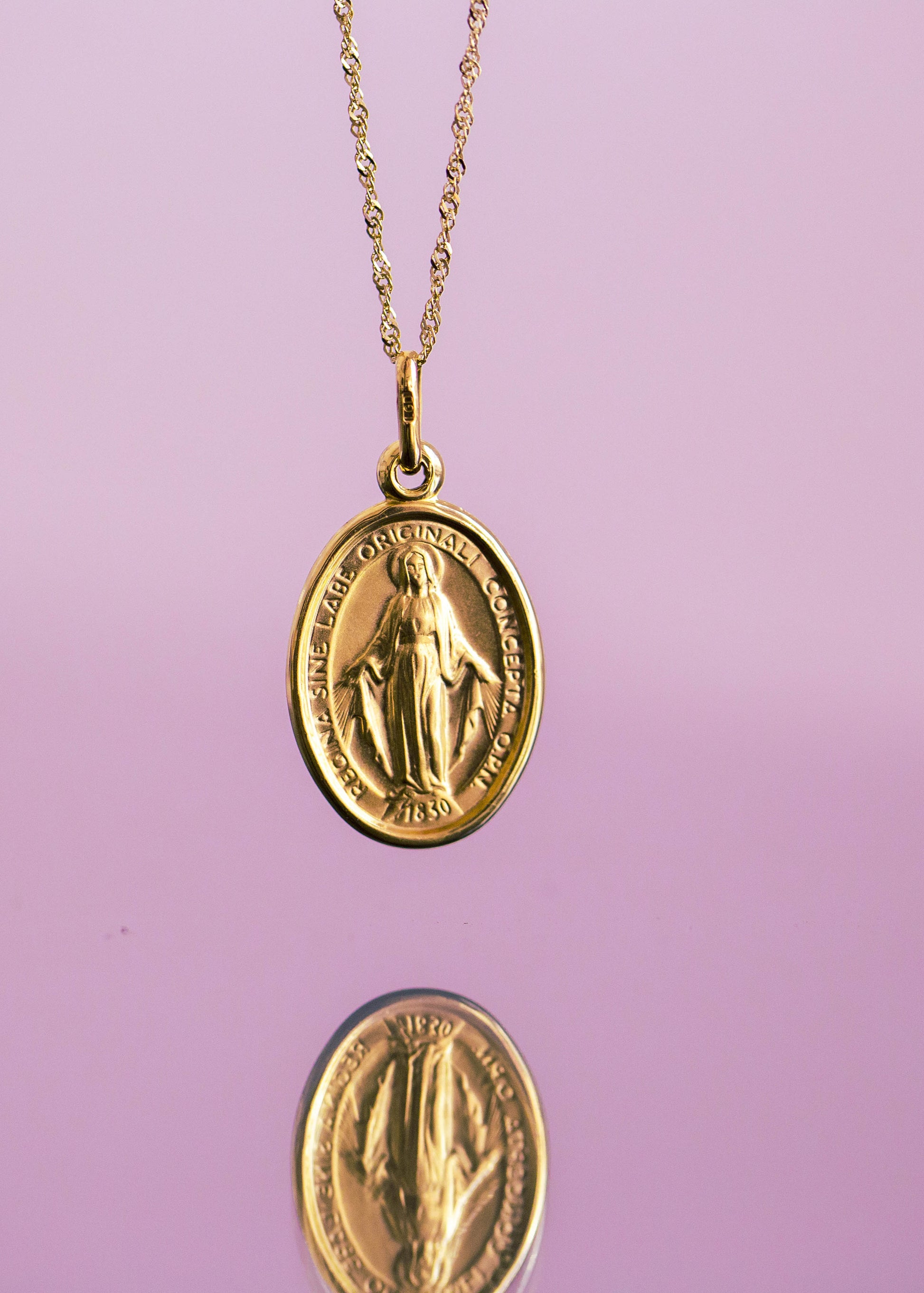 PVLA | 14k Gold Miraculous Mary Medal Pendant Charm Necklace | Guardian Gold Medallion